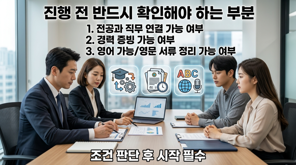 직무 내용, 경력, 학력 이 3가지가 맞지 않으면 진행 중 보완 또는 지연으로 이어질 수 있습니다.